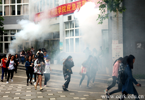 随着指挥长开始的口令,教室里冒出“浓浓黑烟”,教师立即停止授课;在校园广播的引导下,教师带领同学们按照演练所设定的逃生路线有序撤离至安全地点;消防人员迅速到达火灾现场并立即铺设消防水带,压制大火,熄灭浓烟;救援排险组随即开始堵漏工作;医疗救助组迅速将受伤人员抬上担架,护理学院的同学随即为受伤人员进行心肺复苏和包扎固定。演示过程中主持人详细讲解了有关于护理的基本常识,让大家了解了更多关于救援中护理的知识。