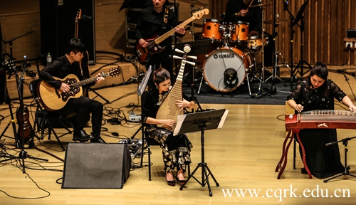 开场曲目是由现代音乐系教师苑丁改编并和王斌、李文杰、范海、雷振宇等全体流行音乐教师共同演奏的爵士风格作品《The Chicken》,作品热情洋溢,动感强烈,获得了观众们的阵阵尖叫。随后,分别由琵琶教师李曼和古筝教师张闻莺演奏的《琵琶语》、《天空之城》(曾格男改编)、《蝴蝶与蓝》三首民乐与现代音乐相结合的乐曲,使得观众在聆听现代音乐的同时也更深入的了解了中国民乐。之后以二胡、琵琶与电声乐队融合演奏的爵士版《康定情歌》,由手风琴、小提琴、琵琶共同演奏的《当查尔达什遇上玫瑰花》,完美地诠释了民族乐器与现代音乐元素的碰撞与交融。现代音乐系主任王宁在演奏二胡曲《小毛驴》时,还邀请了台下30余位带了二胡的观众和他一同演奏这首乐曲,台上台下欢乐一片。