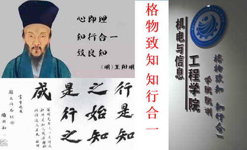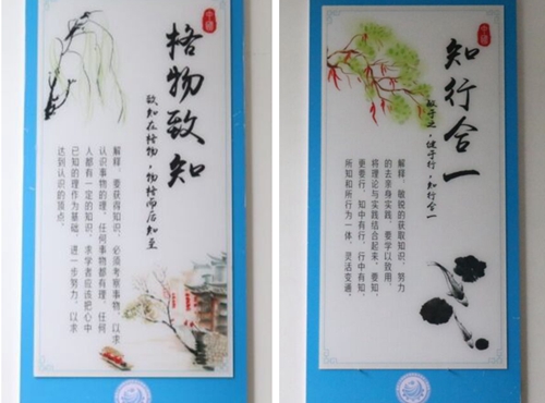 学院各楼层围绕 “格物致知”、 “知行合一”、“不忘初心”、“止于至善”和“敦品励学”五个主题的名人名言,呼应“格致楼”的来历,体现“知行合一”的要求。