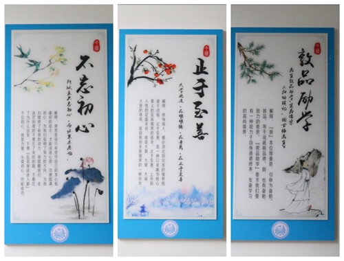“格物致知”、 “知行合一”、“不忘初心”、“止于至善”和“敦品励学”五个主题的名人名言