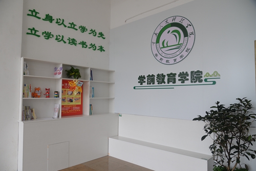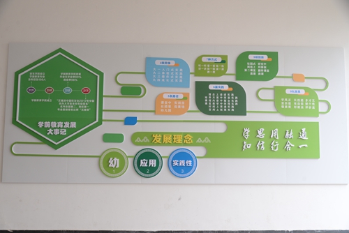 教学楼大厅的主墙上用院徽、院风等向未来的幼儿教师们灌输“关爱幼儿、尊重幼儿、幼儿为本”理念;在教学楼道中用外教育名家的格言为引,照亮学前教育学子未来的职业发展之路;大厅右墙,展示了学院在九大发展理念引领下着力培养学生的创新精神与实践能力;大厅一角的消防栓被富有创意地建成书架,并以“立身以立学为先,立学以读书为本”,勉励同学们修养品行从学习开始,学习以读书为根本。色彩方面,我们以绿色为主题色,嫩绿色象征着儿童的可爱与脆弱,提醒未来的幼儿教师们要有爱心、细心和耐心;翠绿色则代表了我院学子的青春活泼,以及学院发展的勃勃生机。