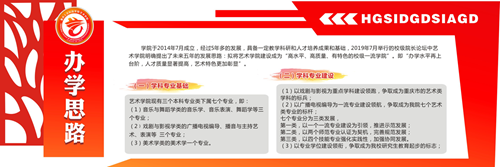学院确定了以红黄系为主色调的视觉传达体系,旨在展示艺术学院师生的热情与活力,通过巧妙构思,将学院三大专业方向的特色在院徽上融为一体。根据设计构思,在学院两座主体教学楼(广艺楼、八音楼)开辟学院沿革、学院概况、办学思路及目标、办学特色等板块,配以图文集中展示艺术学院成立五年多来在学科建设、专业发展、艺术实践等方面的成果。彰显学院特色,营造“有精神、有内涵、有特色”的育人环境。