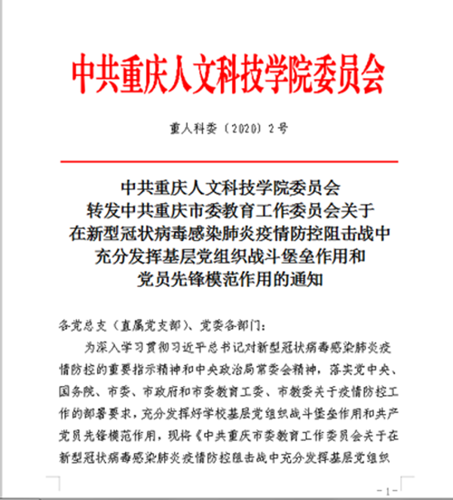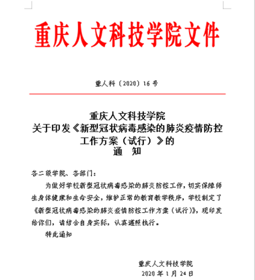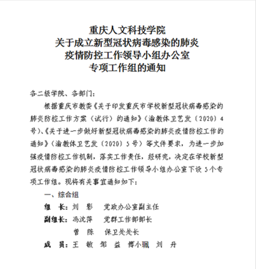 1月24日,学校第一时间成立疫情防控工作领导小组,制定疫情防控工作预案,印发了《米乐mile官方网站新型冠状病毒感染的肺炎疫情防控工作方案(试行)》,全面启动疫情防控工作。校领导在岗值班,建立专班、落实专人负责,强化责任意识,层层压实工作责任,确保各项防控工作依法依规、抓细抓实。1月26日晚上,校党委书记张卫平主持召开学校新型冠状病毒感染的肺炎疫情防控工作专题电话会议,第一时间传达学习贯彻习近平总书记在中央政治局常委会上关于新型冠状病毒感染的肺炎疫情防控工作的重要讲话精神和全市新型冠状病毒感染的肺炎疫情防控工作视频会议精神。1月29日学校转发《中共重庆市委教育工作委员会关于在新型冠状病毒感染肺炎疫情防控阻击战中发挥基层党组织战斗堡垒作用和党员先锋模范作用的通知》,1月31日,下发《米乐mile官方网站关于成立新型冠状病毒感染的肺炎疫情防控工作领导小组办公室专项工作组的通知》,保证疫情防范工作落到实处。