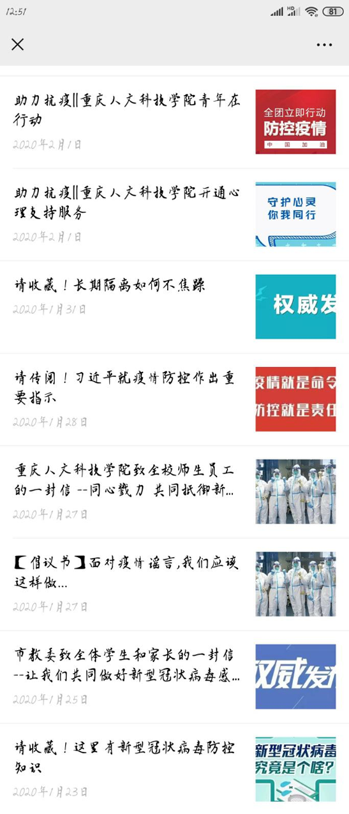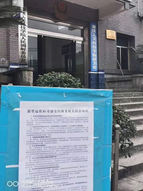 人文医院向全校师生发布了《新型冠状病毒感染的肺炎相关防治知识》,加强与合川区卫健委、合川区教委的联系,按要求做好了红外体温测量仪、N95口罩、外科口罩、消毒物品等相关防控物资的申购工作。特别设立了发热门诊,通过线上对全体医务人员开展病毒防范培训。据悉,从2月3日开始,校医院对学校进行大规模消毒工作。