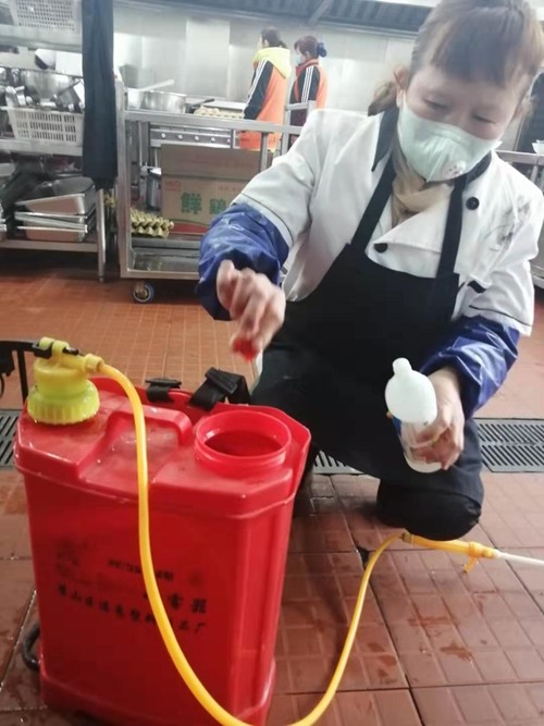 后勤处为在校值守人员配备口罩,工作人员每天上岗前必须测量体温,对食堂等公共场所定期消毒。
