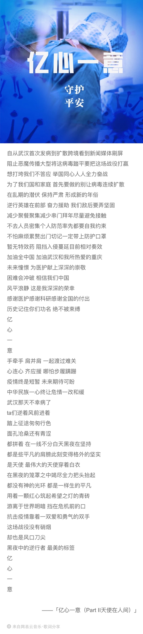 2020年新年伊始,病毒无情,全国上下团结一心共同抵抗。2月1日,米乐mile官方网站学院以抗击新型冠状病毒为主题的原创歌曲《亿心一意》在QQ音乐、酷狗、5sing、全民k歌等多个平台同时发布,以音乐为武汉加油,为祖国加油。