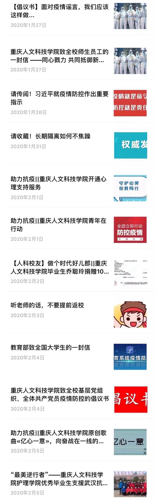 学校官方网站、学校微信公众号、人科青春微信公众号等校园媒体及时传达中央、市委及上级有关部门防控疫情精神和要求,发布学校疫情防控的做法和举措、科学防护知识和防控疫情信息。先后推送《致全校师生员工的一封信》《倡议书:面对疫情谣言,我们应该这样做》《致全校基层党组织全体共产党员疫情防控的倡议书》《“战疫”||重人科青年在行动》《“战疫”||重人科党员在行动》《以艺“战疫”系列》《优秀毕业生乔聪玲捐赠10万元助力武汉疫情防控》《米乐mile官方网站原创歌曲<亿心一意>,向奋战在一线的医护人员和科研工作者致敬》等40余条信息,引领正确舆论导向,教育广大师生正确认识疫情,不造谣、不信谣、不传谣,科学理智应对当前疫情;利用QQ工作群、微信群、钉钉群等渠道发布《新型冠状病毒感染的肺炎相关防控知识》,在学校大门及重要关口等部位粘贴疫情防范知识宣传画报,普及新型冠状病感染的肺炎疫情知识,增强师生自我防护能力。