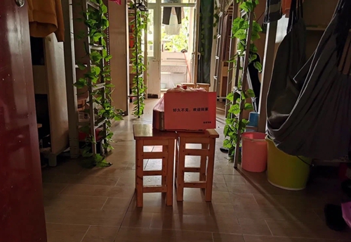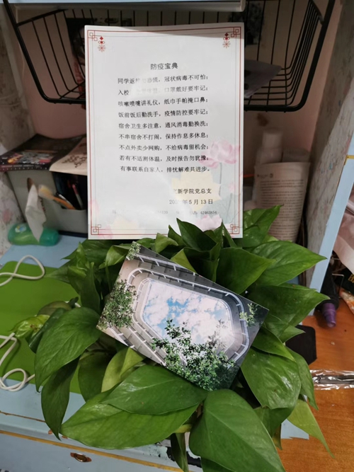 工商学院提供的爱心大礼包,包括洗手液、洗洁精、消毒湿巾等日常洗护消毒用品,最暖心的是竟然还有一张窝心的手写卡片;政治与法律学院的大礼包内除了日化用品外还有甜蜜的糖果;文学与新闻传播学院更是别具匠心的将一盆盆绿萝搬入同学们的寝室……