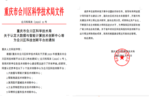 近日,学校大数据与智能计算技术创新中心、智能制造技术创新中心、家用医疗器械技术创新中心、工业控制信息安全技术创新中心、车辆综合服务技术创新中心等5个技术创新中心获批合川区科技创新平台,实现学校厅局级以上高层次科研平台零的突破。
