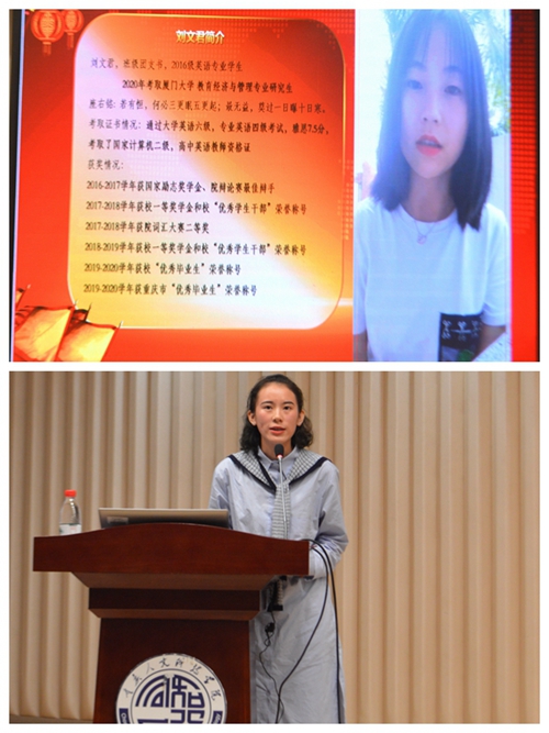 2020届思想政治教育毕业生、四川外国语大学研究生姚知蓉,2020届英语教育专业毕业生、厦门大学研究生刘文君,在会上分享了自己的考研经验,告诉学弟学妹在考研路上要防止“踩雷”,充分利用好学校各种资源和设施,永不言弃,量力而行,尽力而为。