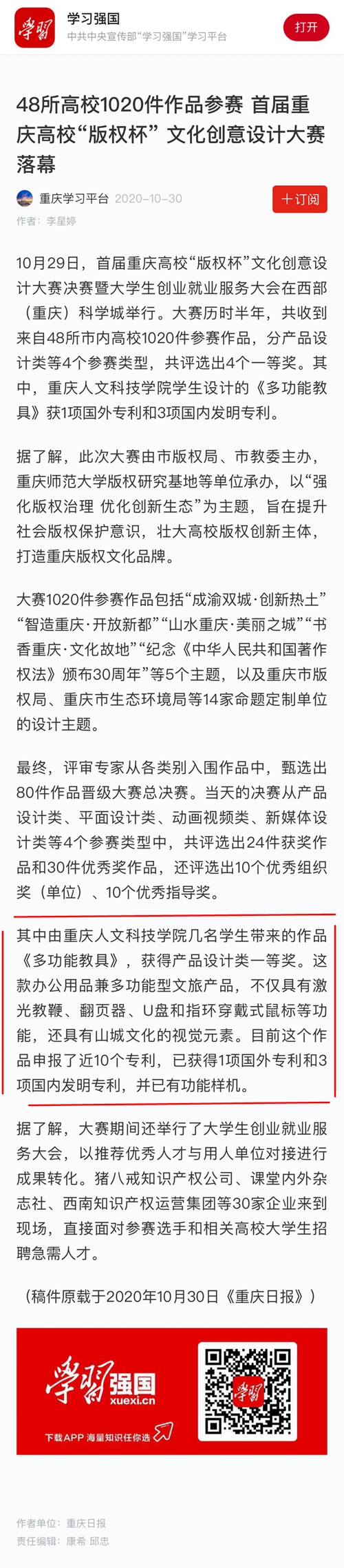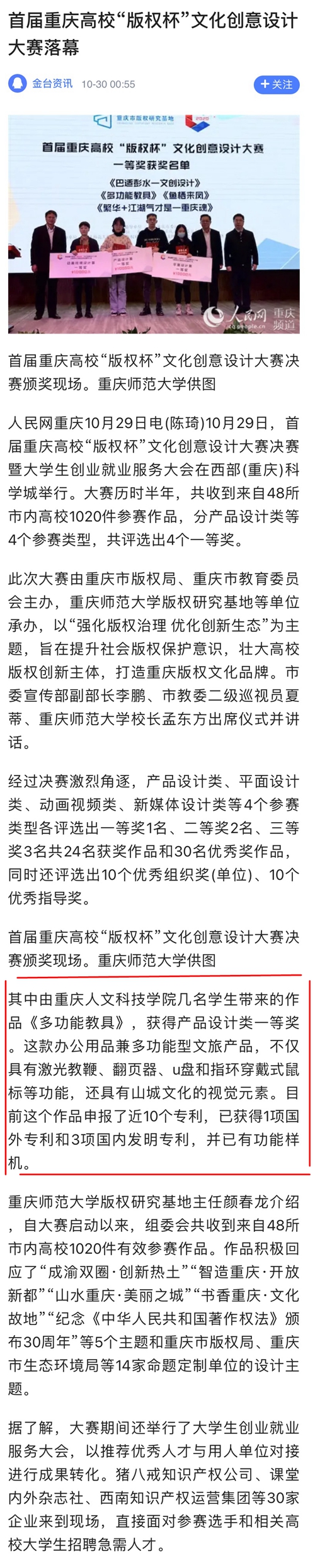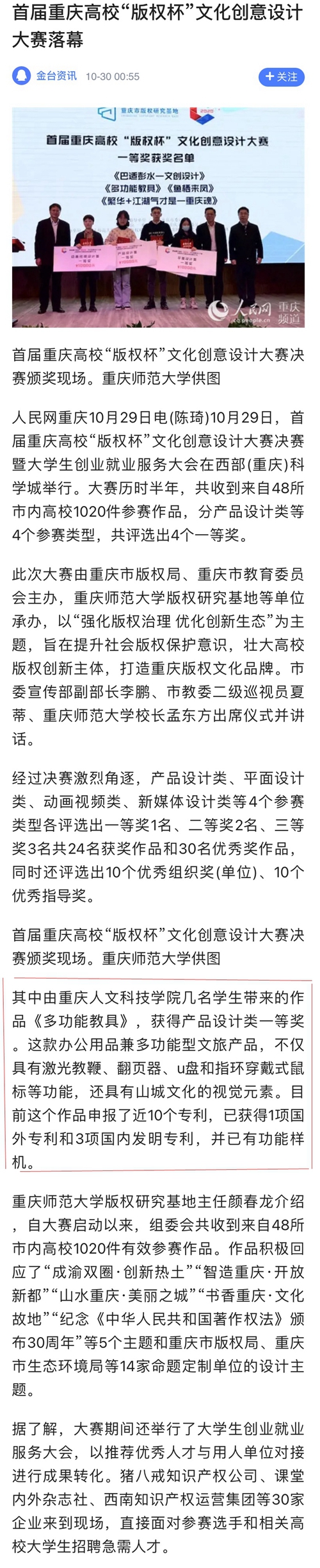 10月29日,米乐官网设计作品《多功能教具&美丽之城》荣获2020年首届重庆高校“版权杯”文化创意设计大赛产品设计类一等奖。因其多功能属性、兼具山城文化元素、拥有版权并申报10项专利、已获1项美国专利及3项国内发明专利等广受关注,被人民网、新华网、学习强国、《重庆日报》等多家主流媒体点名宣传报道。