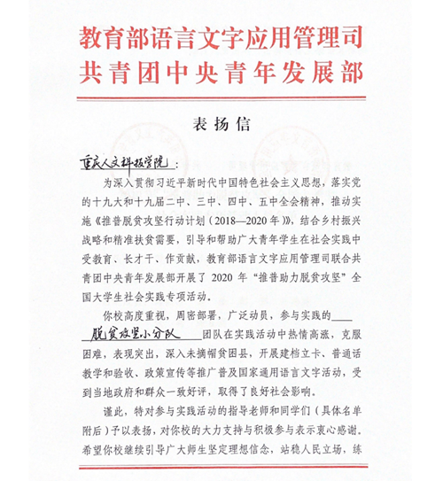 近日,教育部语言文字应用管理司、共青团中央青年发展部向米乐官网发来表扬信,对参加教育部语言文字应用管理司联合共青团中央青年发展部开展的2020年“推普脱贫攻坚”全国大学生暑期社会实践专项活动,由米乐官网6名优秀大学生组成“脱贫攻坚小分队”在活动中做出的成绩、取得的良好社会影响专文提出表扬。