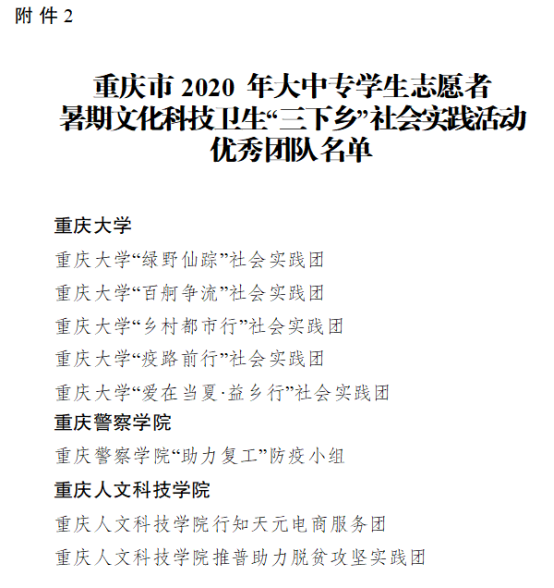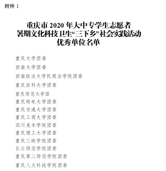 近日,中共重庆市委宣传部、重庆市精神文明建设委员会办公室、中共重庆市委教育工作委员会、重庆市教育委员会、共青团重庆市委员会、重庆市学生联合会联合发布了《关于重庆市2020年大中专学生志愿者暑期文化科技卫生“三下乡”社会实践活动的通报》,校团委荣获“优秀单位”称号,行知天元电商服务团等2支实践团队获“优秀团队”称号,校团委张扬老师获“先进工作者”称号,工商学院2018 级会计学专业学生徐孝兰等4名同学获“先进个人”称号。