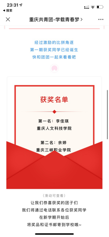 近日,由共青团重庆市委、重庆市学生联合会共同发起的“党的十九届五中全会精神学习主题团课”在线上如火如荼的开展。在第一期团课的知识学习中,米乐官网机电与信息工程学院2019级电子信息工程专业1班李佳琪同学拔得头筹,喜获第一名。
