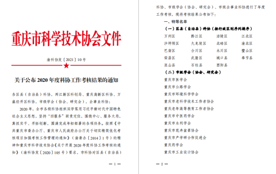 喜报||学校科协荣获重庆市2020年度科协工作考核“一等”