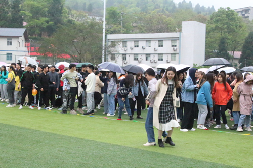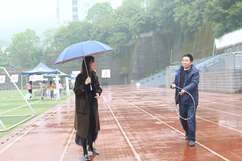 虽然下着淅淅沥沥的小雨,却丝毫不影响同学们参赛热情,整个运动场上洋溢着同学们加油的呐喊声和欢呼声,赛场的志愿者们也在雨中辛勤工作,坚守岗位,确保活动井然有序地开展。
