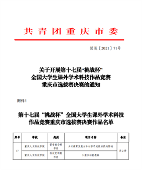 喜报|米乐官网两项作品入围第十七届“挑战杯”全国大学生课外学术科技作品竞赛重庆市选拔赛决赛