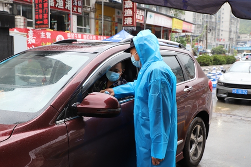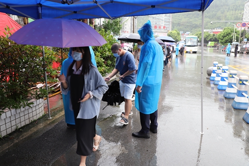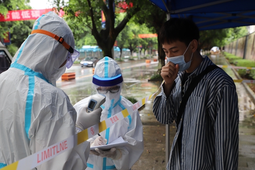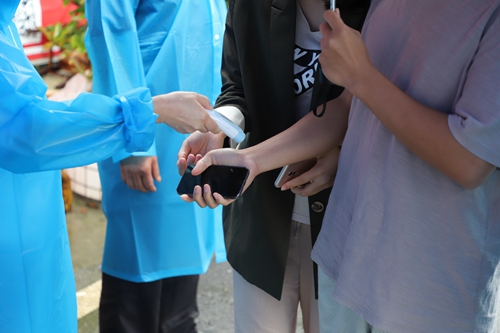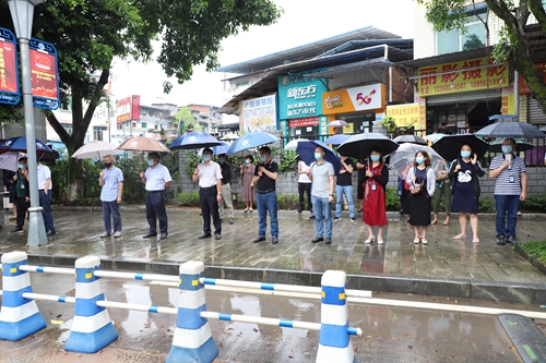 演练于下午3时准时开始,演练内容为:学校交通车到达学校大门外,教职工下车有序通过校大门检测处,在检测体温时发现一名教职工体温异常(体温≥37.3℃),并伴有咳嗽症状,执勤安保人员立即将体温异常人员引导至临时隔离区,同时向学校人文医院发热门诊、疫情防控办公室进行报告,现场安保人员对其一同乘车教职工做好身份信息登记、情绪安抚工作,等待人文医院120到达处置。