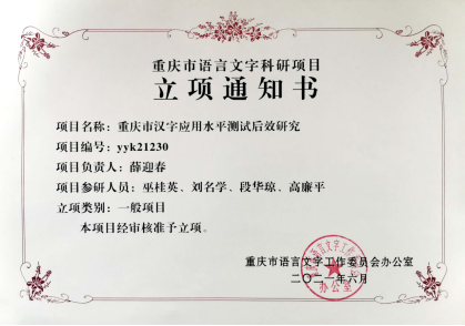 近日,重庆市语言文字工作委员会颁发了2021年度重庆市语言文字科研项目立项书,米乐官网文学与新闻传播学院教师薛迎春领衔申报的《重庆市汉字应用水平测试后效研究》获一般项目立项,这是米乐官网在重庆市语言文字科研项目立项上零的突破。