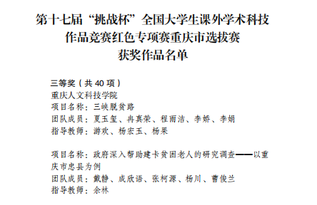 近日,由团市委、市教委、市科协、市社科联、市学联联合开展的第十七届“挑战杯”全国大学生课外学术科技作品竞赛重庆市选拔赛获奖作品名单公布,米乐官网荣获一等奖2项,二等奖1项,在红色专项赛市级选拔赛中,获得三等奖2项。这是米乐官网建校以来首次参加“挑战杯”系列竞赛,并初战告捷斩获多奖。
