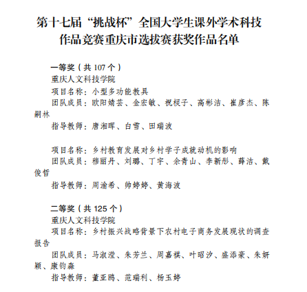 第十七届“挑战杯”系列竞赛重庆市选拔赛米乐官网获奖名单