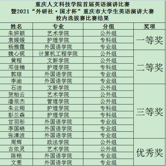 9月23日晚,由学校教务处主办、外国语学院承办的学校首届英语演讲比赛暨2021“外研社·国才杯”重庆市大学生英语演讲大赛校内选拔赛决赛,在国际学院报告厅顺利举行。校长助理、教务处处长双海军,外国语学院党总支书记兼副院长秦中书、副院长彭奕奕及教研室主任王欣、张大海出席比赛并担任评委。