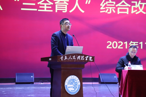 党委副书记、副校长、学校“三全育人”综合改革试点学校建设领导小组副组长杨霄从方案出台背景、综合方案说明、分项方案说明、方案组织实施四个层面,详细解读了学校《“三全育人”综合改革试点学校建设方案》和11个分项建设子方案。