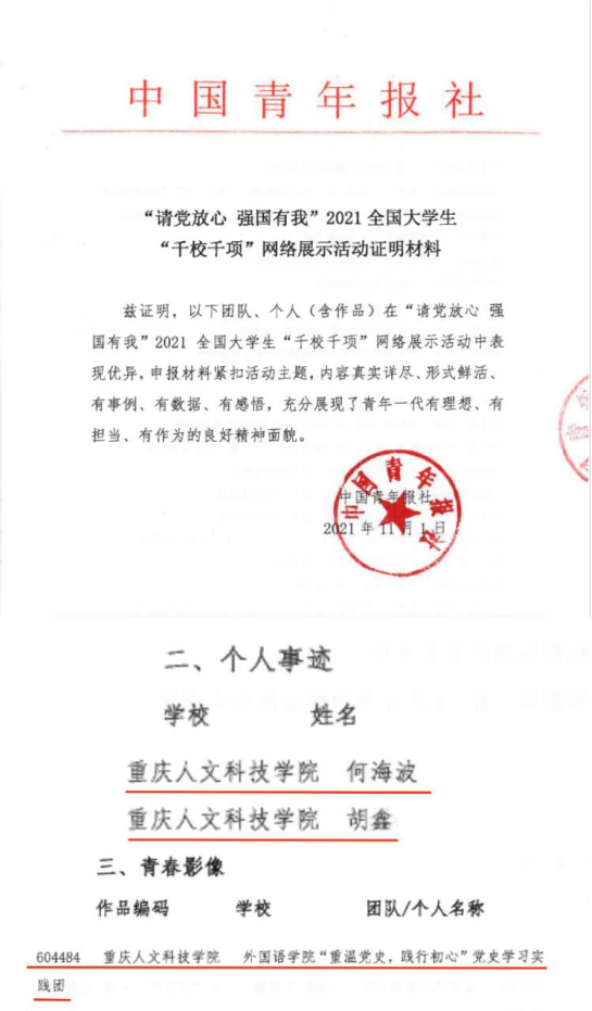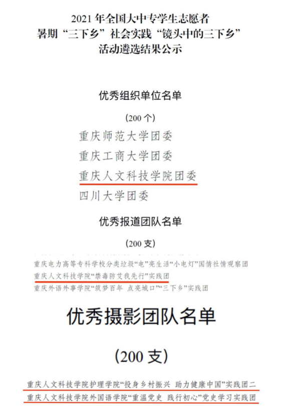 近日,由共青团中央青年发展部、中国青年报共同举办的2021年全国大中专学生志愿者暑期“三下乡”社会实践“镜头中的三下乡”成果遴选活动评选结果揭晓,在此次活动中,学校团委荣获“优秀组织单位”荣誉称号,“投身乡村振兴 助力健康中国”实践团、“重温党史 践行初心”党史学习实践团获“优秀摄影团队”荣誉称号, “禁毒防艾我先行”实践团获“优秀报道团队”荣誉称号。在“请党放心 强国有我”2021全国大学生“千校千项”网络展示活动中,米乐官网“重温党史,践行初心”党史学习实践团以及外国语学院胡鑫同学、机电学院何海波同学分别获集体与个人奖项。