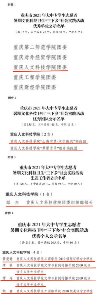 近日,中共重庆市委宣传部、重庆市精神文明建设委员会办公室、中共重庆市委教育工作委员会、重庆市教育委员会、共青团重庆市委员会、重庆市学生联合会联合发布了《关于重庆市2021年大中专学生志愿者暑期文化科技卫生“三下乡”社会实践活动的通报》,学校团委荣获“优秀单位”称号,“草原青马”推普实践团、“山海有情·闽宁振兴”实践团获“优秀团队”称号,团委教师邹杰获“先进工作者”称号,工商学院2019级经济学专业学生黄莞婷、文学与新闻传播学院2019级汉语言文学专业学生谭敏、文学与新闻传播学院2019级汉语言文学专业学生谭瑶、外国语学院2018级英语专业学生胡鑫获“优秀个人”称号。