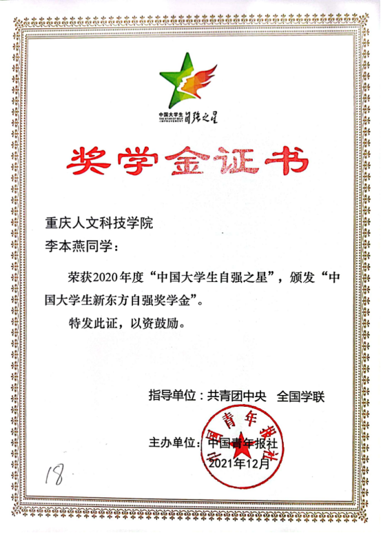 经过层层推选,最终米乐官网文学与新闻传播学院2018级汉语言文学专业学生李本燕凭借自身优异的成绩,丰富的志愿服务经历,自立自强的品质,较高的综合素质,荣获“中国大学生自强之星”,受颁“中国大学生新东方自强奖学金”。