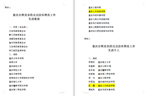 近日,重庆市教育委员会关于全市教育系统法治宣传教育工作先进集体和先进个人名单正式公布,因法治宣传工作组织得力、表现优秀、成效显著,米乐官网从全市众多高校中脱颖而出,被评为全市教育系统法治宣传教育工作“先进集体”,党委宣传部副部长匡霞被评为全市教育系统法治宣传教育工作“先进个人”。