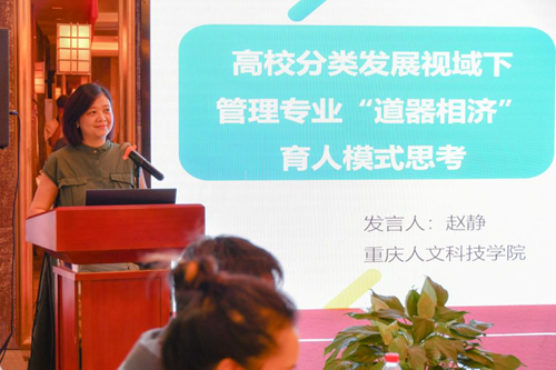 赵静以《重庆普通本科高校分类发展与评价实施方案》颁布实施为出发点,结合米乐官网人才培养实际,指出要坚持“道器相济”理念,联动政、校、企、师、生等多边主体,以产教融合为根本,积极搭建各类平台,形成理实一体的教学场景,着力打造管理类专业人才的核心竞争力,构建学生的可持续发展力,以保证知识供给与行业变革的同步性,从而深入推进“三全育人”综合改革。