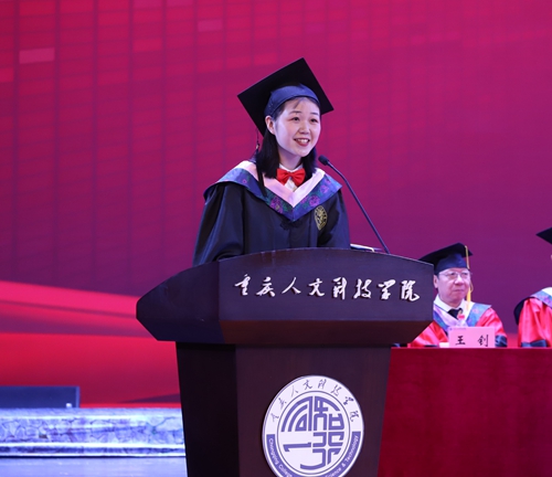 2022届毕业生代表、文学与新闻传播学院秦秋杭在发言中回顾了自己大学四年的铿锵步履,感恩祖国给予的和平安定,感谢学校提供的学习平台和资源、老师的不断容错和全体同学和谐共处,表示将始终牢记习近平总书记在视察中国人民大学时对广大青年的殷殷嘱托,无论身处何方,都将志存高远、脚踏实地,不畏艰难险阻,勇担时代使命,为实现中华民族伟大复兴的中国梦贡献青年人的力量。