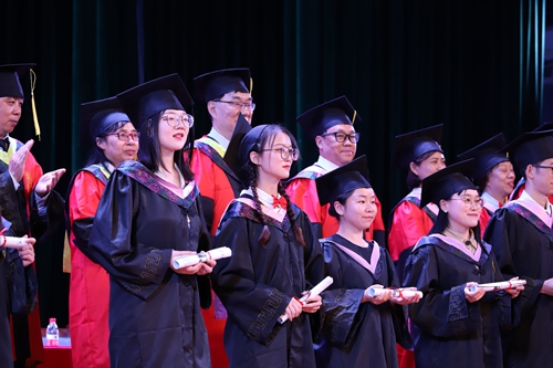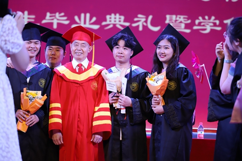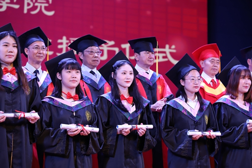 毕业生代表依次登台,由学位评定委员会全体成员颁发证书,拨正帽穗。全体学子手捧证书,满脸微笑,洋溢着辛苦付出后收获成果的满足与幸福。