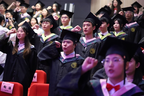 现场全体毕业生起立,举起右拳,共同向母校庄严宣誓:“传承人科精神,发扬人科校训。不负师生教诲,母校培养;不负父母期望,国家期许;不忘初心,勇挑重担;不惧风雨,勇往直前。无论天涯海角,山高水长;无论从业创业,故乡他乡。立报国之志,践报国之行。让青春在党和人民最需要的地方绽放!”