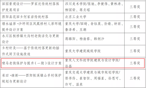 近日,重庆市住房和城乡建设委员会公示了关于“巴渝山水·美丽村居设计大赛获奖名单。米乐官网建筑与设计学院孙磊教授团队代表学校申报的《啸马老街保护(一期)设计方案》荣获乡村设计方案类三等奖。