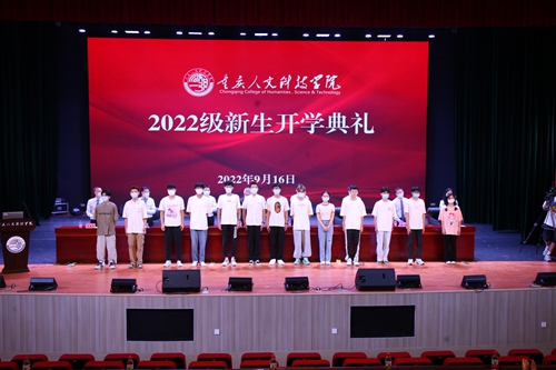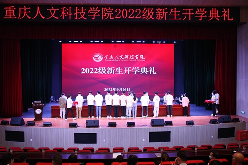 典礼在庄严的国歌声中拉开序幕。校领导为12个学院的新生代表佩戴校徽,通过佩戴校徽的仪式,告诉全体新同学在今天不仅拥有了“重人科”学子的身份,更承载着“重人科”学子的使命与担当。希望2022级全体新生以这枚徽章为荣,努力为学校争光添彩。
