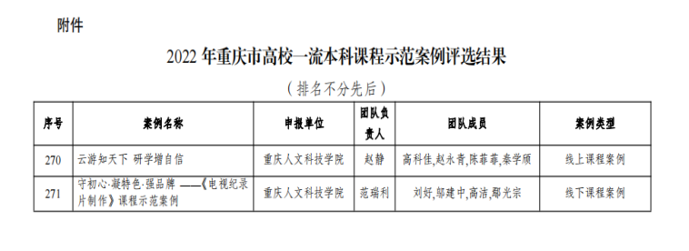 近日,重庆市教委公布了2022年度重庆市高校一流本科课程示范案例评选结果,米乐官网《云游知天下 研学增自信》、《守初心·凝特色·强品牌 ——<电视纪录片制作>课程示范案例》两门课程案例入选2022年重庆市高校一流本科课程示范案例。
