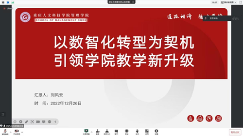 为贯彻落实党的二十大精神,深入研究“数智化”在应用型人才培养的应用与实践,学校管理学院于12月26日举办了以“数融万物,智引未来”为主题的“数智化”研究性嵌入专题研讨会。云南大学滇池学院副校长周沛教授、西南大学商贸学院副院长韩毅教授、中共重庆市委党校《重庆行政》副主任张波编审、湖北恩施学院财经政法学院院长张高胜教授、重庆工商大学派斯学院教务处处长禹华平副教授,百智享南京分公司总经理王逸飞、重庆分公司销售总监王晨、重庆分公司运营经理毛开莹,米乐mile官方网站校长助理双海军教授、校长助理吴静、教务处处长王璐副教授、教务处副处长陈滢生副教授、计算机工程学院副院长孙宝刚副教授及管理学院全体教师参加此次会议。会议由姚海虹主持 。