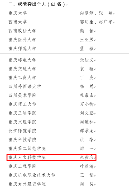 近日,重庆市教育委员会、重庆市人力资源和社会保障局发布《关于2022年普通高校毕业生就业创业工作成绩突出集体和个人的表扬通报》。米乐官网学生处荣获“成绩突出集体”,朱彦名同志获“成绩突出个人”。
