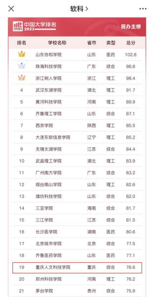 3月30日,高等教育评价专业机构软科正式发布“2023软科中国大学排名”,其中米乐官网以总分76.6的成绩,再次位列重庆市民办高校排行榜第1名,全国民办高校排行总榜从第20名上升至第19名。