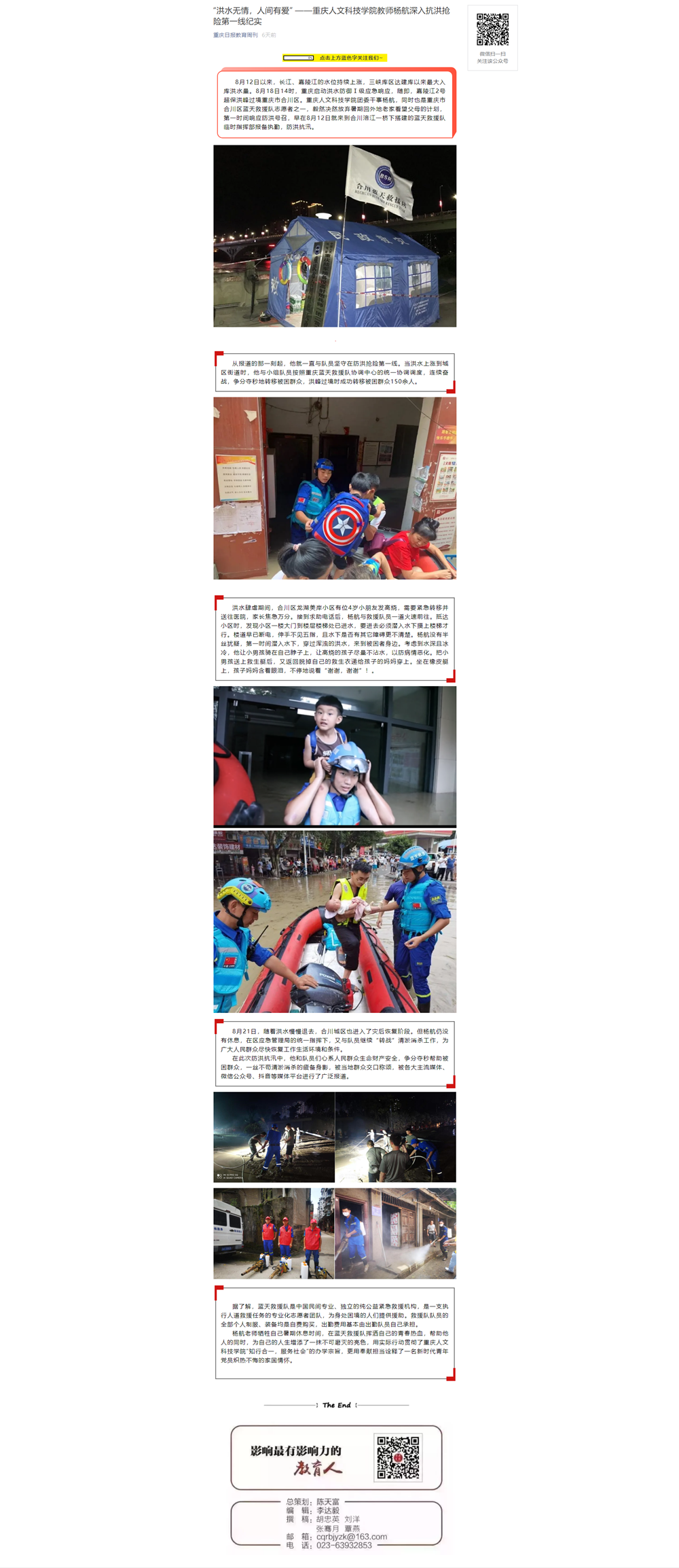 重庆日报:“洪水无情,人间有爱” ——米乐mile官方网站教师杨航深入抗洪抢险第一线纪实