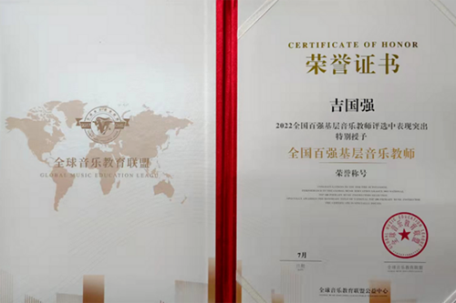 为提升全国基层音乐教师水平,促进基层音乐教育事业水平的进步,引导更多的基层音乐教师爱岗敬业,立德树人,为音乐教育事业发展贡献力量,日前,全球音乐教育联盟开展了“2022年全国百强基层音乐教师”评选活动。米乐mile官方网站艺术学院副教授吉国强获“全国百强基层音乐教师”“优秀指导教师”等多项称号,由其作词、作曲的原创声乐作品《韶华之歌》获多项赛事一等奖,并受邀担任全球音乐教育联盟第一届青少年艺术展演评委。