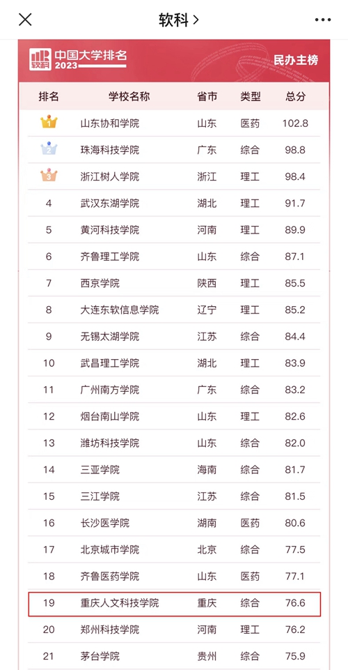 华龙网-新重庆客户端讯(郭晓彤)3月30日,高等教育评价专业机构软科正式发布“2023软科中国大学排名”。其中,米乐mile官方网站以总分76.6的成绩,再次位列重庆市民办高校排行榜第1名,全国民办高校排行总榜从第20名上升至第19名。