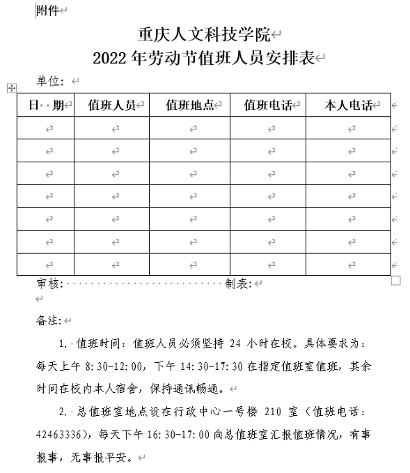 1. 各单位要按照学校《关于印发<休假、值班、加班管理暂行规定(修订)>的通知》(重人科〔2019〕175号)和《关于印发〈值班管理制度(修订)〉的通知》(重人科〔2019〕180号)规定,妥善安排假期的值班工作。学校总值班由党政办公室统一安排,其他单位自行安排值班,并将值班人员安排表(见附件),于4月26日(星期二)12:00前报送党政办公室综合科(行政中心一号楼2-8室)。