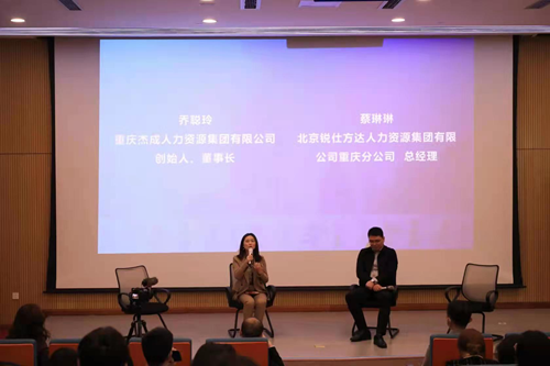 参观结束后,学校师生进行了实践交流分享,杰成集团董事长乔聪玲、锐仕方达重庆分公司总经理蔡琳琳做客分享会现场与同学们面对面交流。会上,大家观看了重庆市人力资源服务各业态宣传片,随后,学生代表樊思瑶、胡颖、潘万东依次上台分享实践教学心得体会,他们一致表示此次活动受益匪浅,不仅开阔了视野、也拓展了行业知识,希望今后能成为人力资源服务行业中的一员,乔聪玲、蔡玲玲也针对学生们提出的问题进行答疑解惑并分享自身宝贵的经验。
