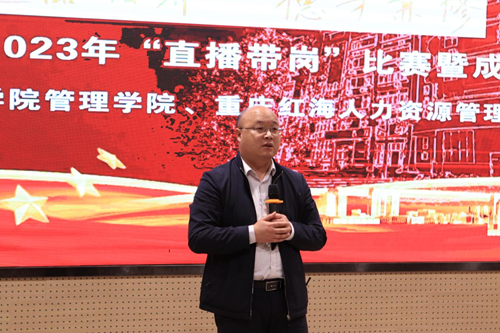 赛前,邓旭升代表学院致辞。他回忆了管理学院与重庆红海人力资源有限公司联合打造实训课程的历程,对指导教师和学生准备此次“直播带岗”汇报比赛的辛苦和付出给予了充分肯定;同时,感谢学校和重庆红海人力资源有限公司提供资源和平台,为管理学院“直播带岗”实训课程的高质量开展提供了有利条件;最后,他希望管理学院能以此为契机,以深度的校企合作推动高水平竞赛和高质量就业。